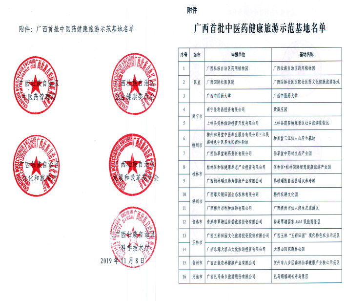自治区中医药局等五个部门在今年7月共同组织开展中医药健康旅游示范基地建设遴选工作。经过组织申报、地方推荐、专家初审、实地评审、有关部门会审、网上公示等环节,最终确定16家基地(公司)为“广西首批中医药健康旅游示范基地”。本批次的“示范基地”,有效期为5年。通过强化“示范基地”的动态管理,加大“示范基地”的扶持力度,不断提升“示范基地”的建设水平,充分发挥示范引领作用,促进我区中医药健康旅游产业快速发展。