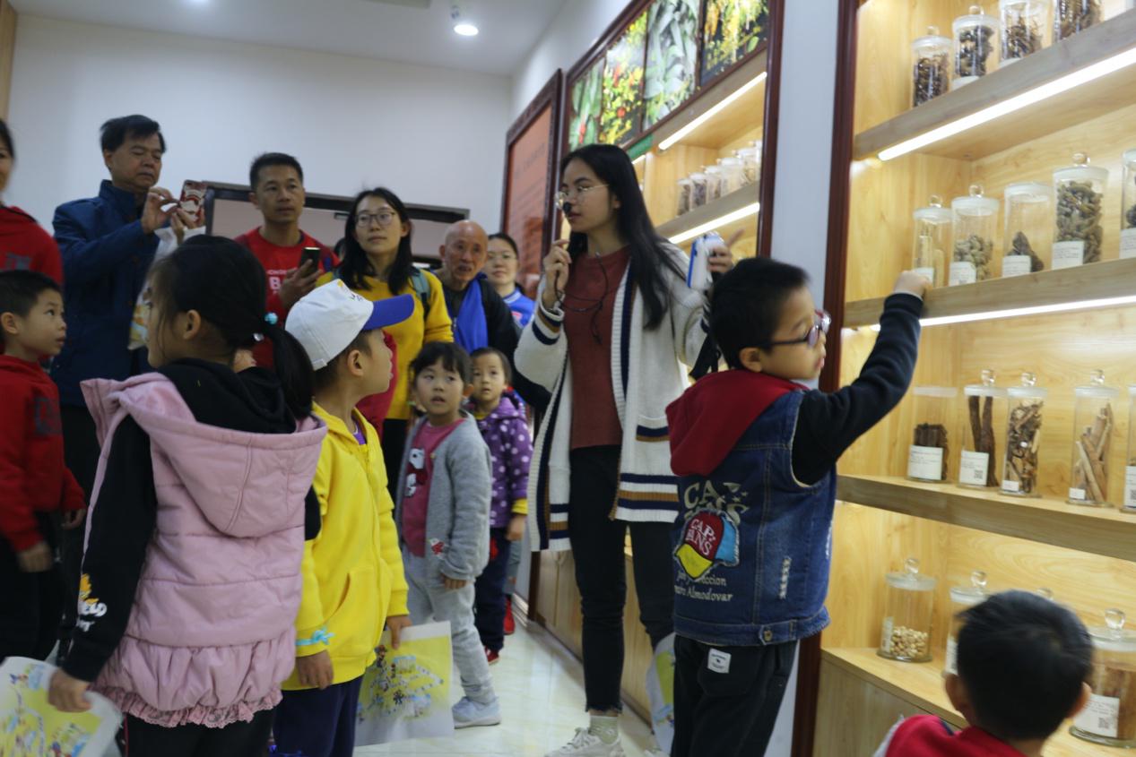 家长带着孩子一起参观中医药材展馆