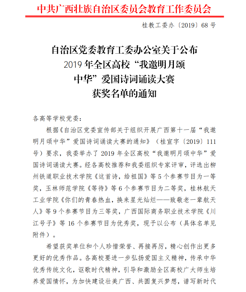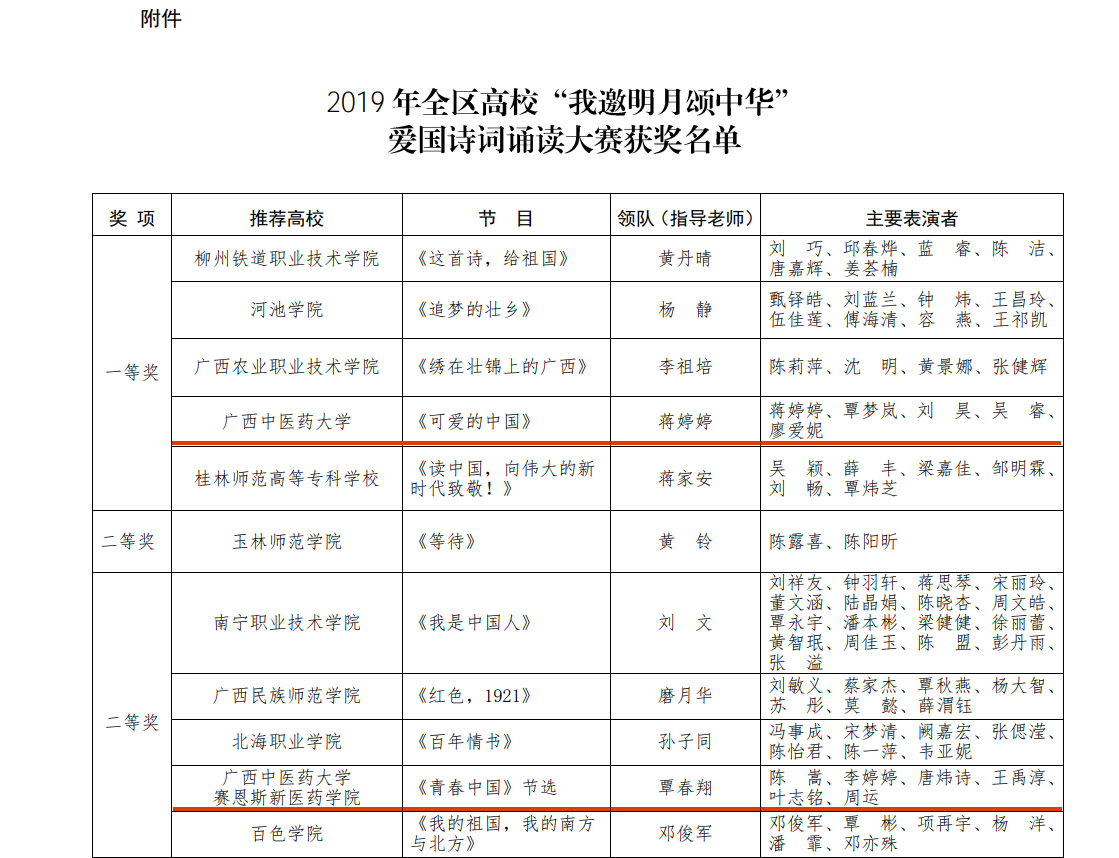 日前,自治区党委教育工委办公室公布了2019 年全区高校“我邀明月颂中华”爱国诗词诵读大赛获奖名单,由Beat365蒋婷婷、覃梦岚、刘 昊、吴 睿、廖爱妮等表演的《可爱的中国》荣获一等奖,由赛恩斯新医药学院陈嵩、李婷婷、唐炜诗、王禹淳、叶志铭、周运等表演的《青春中国》(节选)荣获二等奖。