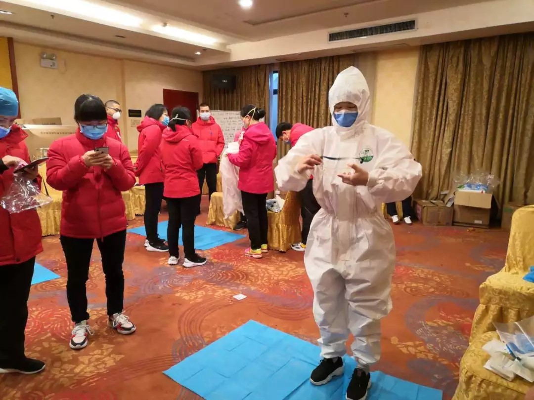 17日,江城武汉的天气不错,皑皑白雪上折射的阳光,白晃晃的有些刺眼。医疗队队员一遍又一遍地熟悉方舱医院工作手册,温习着有关的安全防护、工作环境、工作流程、注意事项等内容,随时准备上“战场”。队员们相互分享了如何熟练地穿脱防护服,如何节约使用物质,如何安全使用口罩、护目镜等的经验做法,深深地体现了家人般的无私关心和温暖爱护,队员们的相互鼓劲,平复那忐忑的心情。