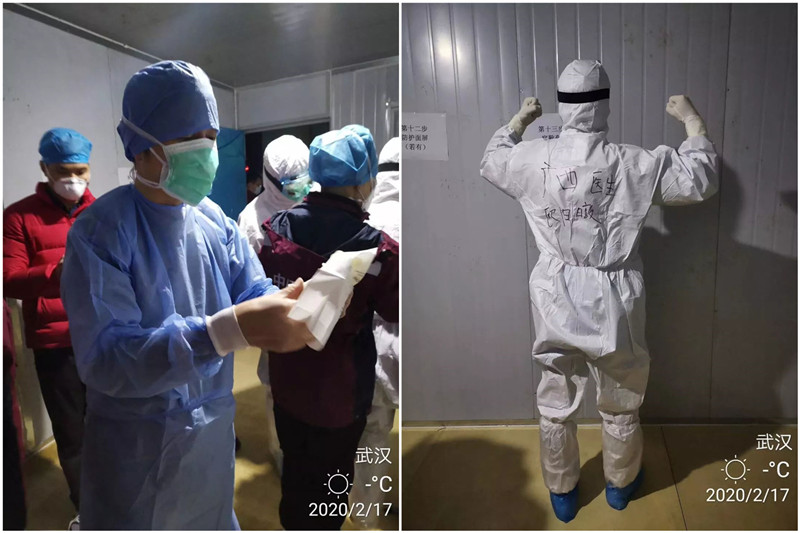 晚上9点,欧阳暾、胡春明、唐运宽、农彩芬等小心翼翼地穿上防护装备,全副武装,自信满满,征战前线。武汉的深夜,寂静而寒冷。“未亲历过前线的艰难险阻,或许在后方就未必对生活知足;不吃苦中苦,不知福中福!难熬的寒夜已经过去,春日正在升起!感谢所有的亲人、领导、老师、同事、同学、朋友等对我的关心和支持!我们,必胜!” 出舱后,欧阳暾在微信朋友圈这样写道。