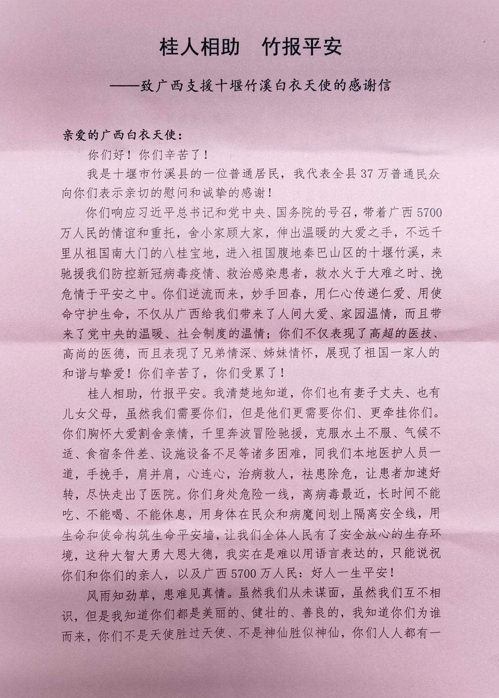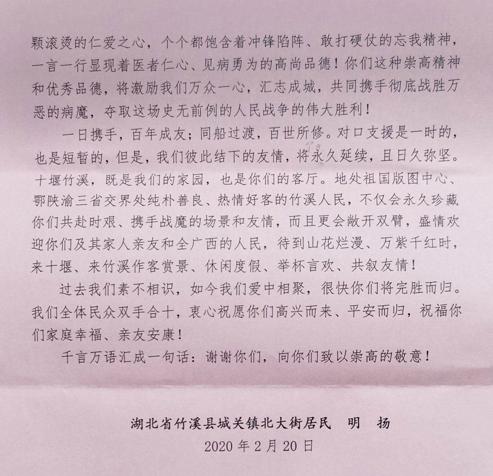 【中医战“疫”】桂人相助 竹报平安——致广西支援十堰竹溪白衣天使的感谢信 日期:2020-02-22 点击数: 次 分享到: 2月20日,竹溪县党委宣传部副部长明扬致信Beat365驰援湖北竹溪医疗队队长陈平,对Beat3659名医疗队员表示感谢。感谢信全文如下: 打印正文 关闭本页
