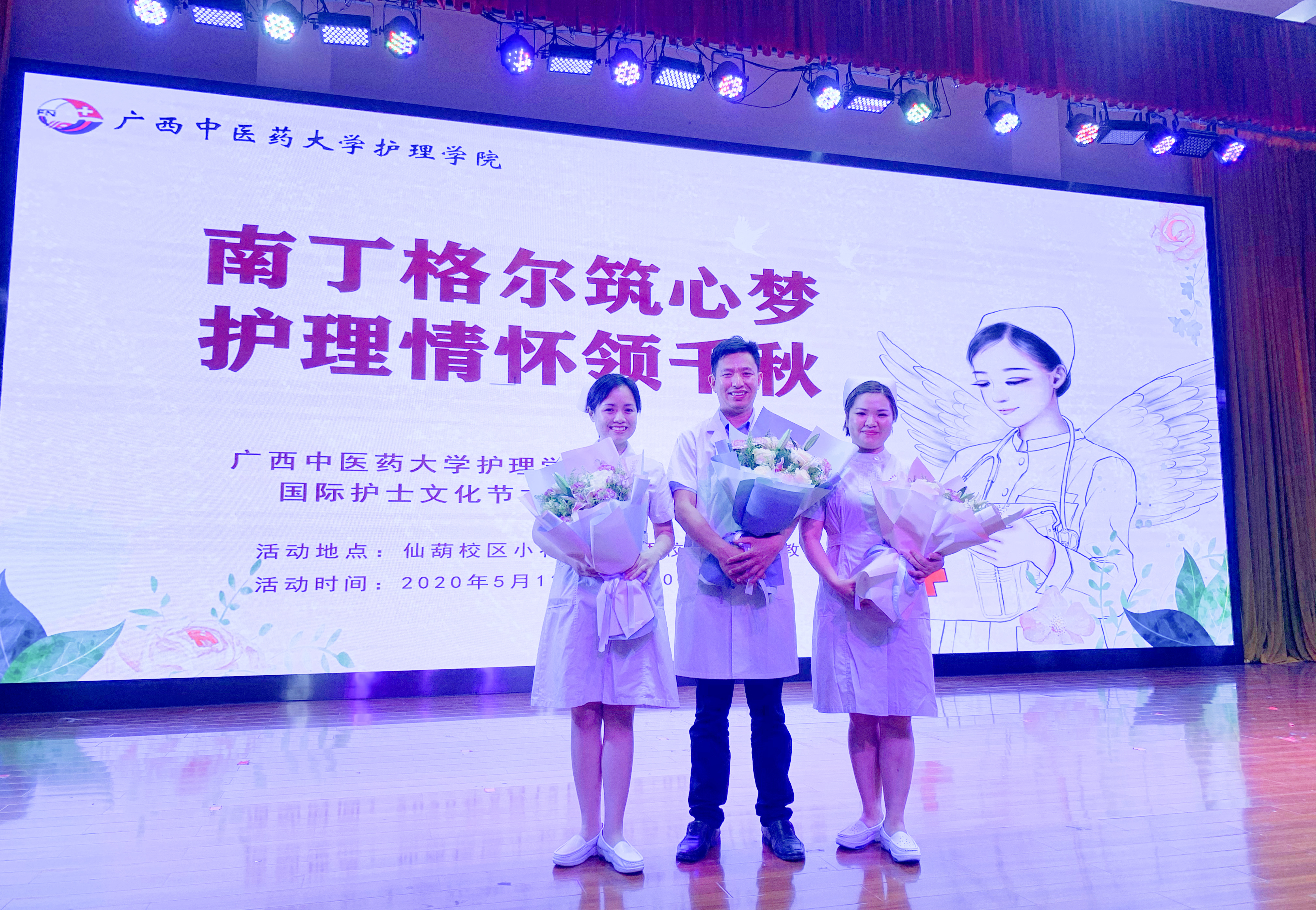 5月12日晚,护理学院采取线上线下全员参与的形式在仙葫校区小礼堂举行“5.12”国际护士节庆祝活动,为即将踏上实习岗位的391名护理学子举行了庄严、神圣的燃烛仪式。学校原党委副书记、纪委书记、广西护理学会理事长杨连招、学校党委副书记庞宇舟、护理学院领导及教师代表等出席活动。广西江滨医院呼吸内科护士长秦运顺、Beat365中国唯一官方网站附属瑞康医院心血管内科一区护士长黎燕、Beat365中国唯一官方网站第一附属医院重症医学科护士明州彦作为抗击新冠肺炎的优秀教师、毕业生代表应邀参加。护理学院党委副书记韩叶芬主持活动。