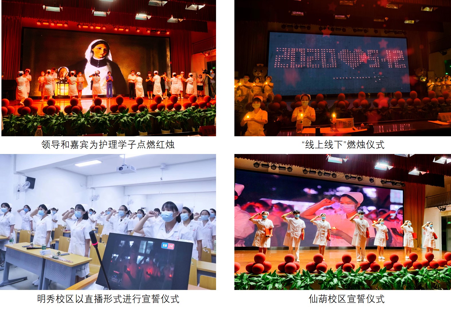 随后,参会领导和嘉宾为2017级24名学生代表进行线下燃烛,367名同学在明秀校区通过列队“2020.5.12”造型的方式进行线上燃烛,燃烛仪式结束后带领全体护生共同宣读南丁格尔誓言。最后,活动在护理学院文工团带来的舞蹈《不忘初心》中圆满落幕。