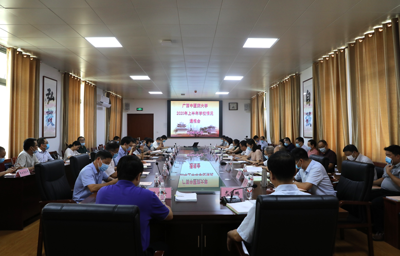 尤剑鹏从学校中心工作、党建工作两部分通报了学校上半年工作情况。在学校中心工作方面,尤剑鹏指出:一是直面疫情防控挑战,积极推进教育教学新常态;二是稳步推进高层次人才引育,为新增博士学位授权点提供人才支撑;三是扎实开展科学研究,为打赢疫情防控阻击战提供技术支撑等中心工作。在党建工作方面,一是全力以赴投身疫情防控阻击战,基层党组织的凝聚力战斗力进一步增强;二是强化理论武装和思想建设,干部师生“四个自信”更加坚定;三是一鼓作气决战决胜脱贫攻坚,脱贫成果进一步得到巩固;四是纵深推进支部规范化标准化建设,党建激励与约束作用进一步发挥;五是持之以恒抓作风改进,“清廉桂中医”建设稳步推进。