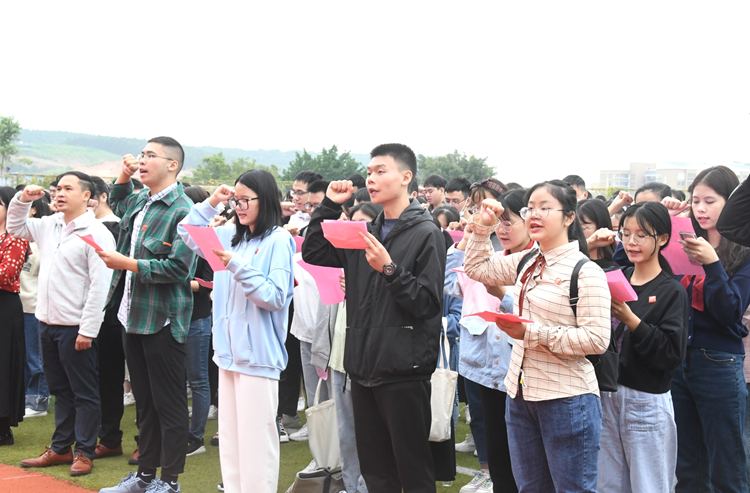 校党委书记尤剑鹏,副书记庞宇舟、何并文,副校长吴琪俊、戴铭,纪委书记韦雪芳、总会计师何刚亮以及各部门、学院负责人、教师、辅导员代表出席典礼。何并文主持典礼。