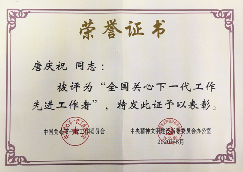 唐庆祝同志荣获“2020年全国关心下一代工作先进工作者”荣誉称号