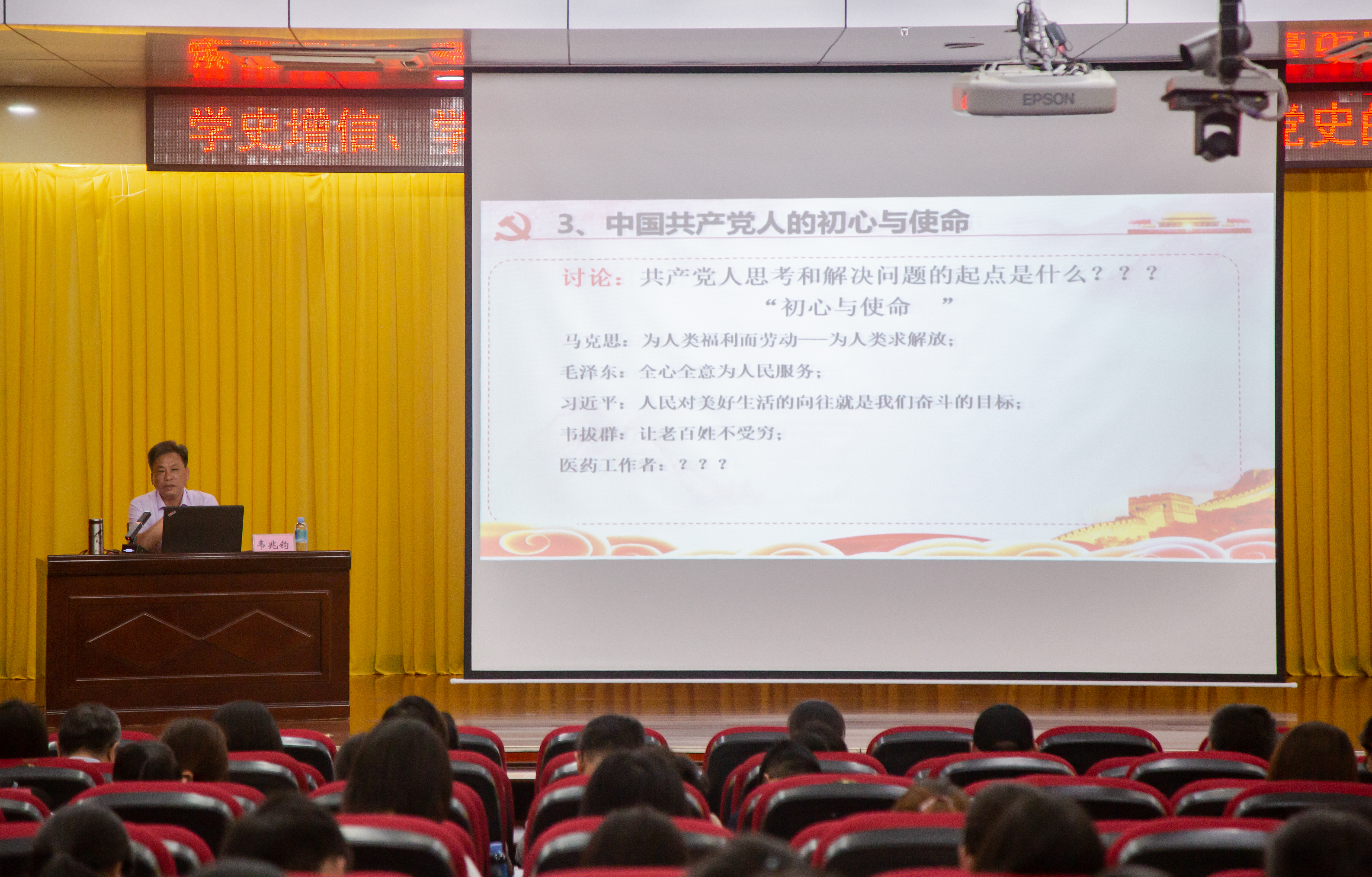 韦兆钧围绕共产党人的初心使命、中国革命道路的艰难选择以及信仰是支撑共产党人前进的伟大力量三个方面进行了“学史增信、学史力行——大历史观背景下学习中共党史的体会”的专题报告。他以马克思的成长经历为主线索展现了马克思主义的精神实质,结合广西区情分析了新时代中国共产党人的初心与使命,并通过中共一大代表的不同命运轨迹阐释了初心使命的力行是一个艰难的历程,需要共产党人坚定理想信念,砥砺前行。他通过湘江战役对中国革命的重要意义和信仰支撑中国共产党人汲取磅礴伟力的具体事例,描绘了中国共产党百年征程波澜壮阔,百年初心历久弥坚。
