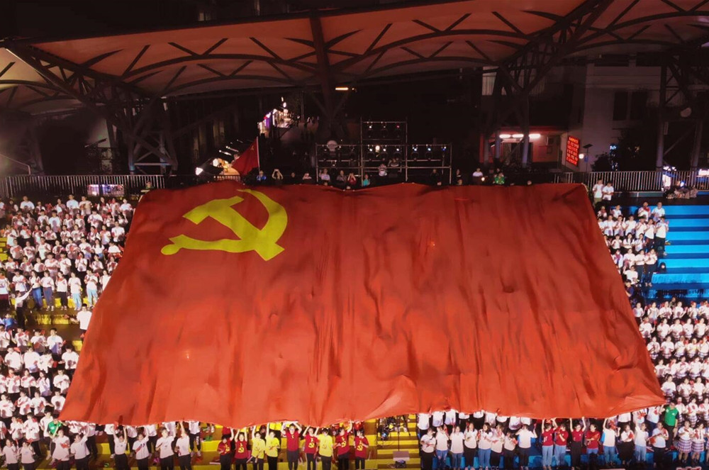 合唱《没有共产党就没有新中国》展示巨幅党旗