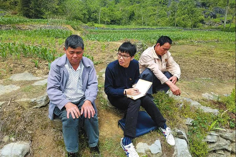兰庆同(中)到田间与贫困群众交谈