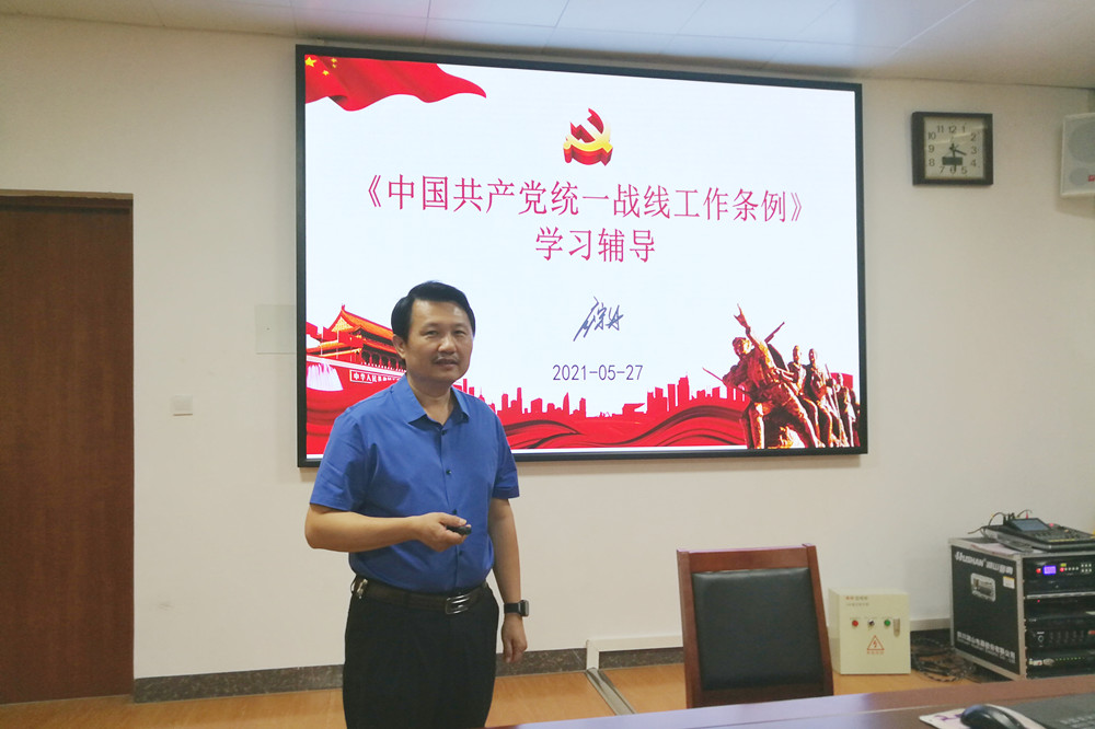 5月27日下午,Beat365中国唯一官方网站统一战线工作领导小组会议暨《中国共产党统一战线工作条例》(以下简称《条例》)专题辅导会在仙葫校区召开。学校党委副书记庞宇舟就《条例》作专题辅导,党委统战部部长姜建萍主持会议。