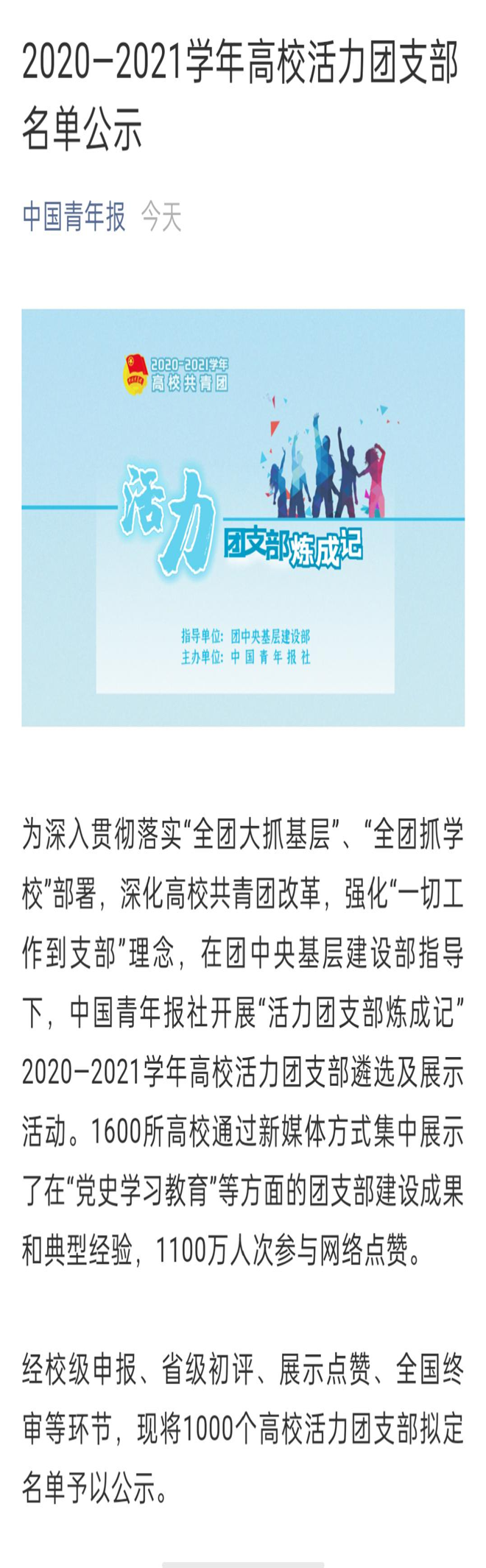为深入贯彻落实“全团大抓基层”“全团抓学校”部署,深化高校共青团改革,强化“一切工作到支部”理念,在团中央基层建设部指导下,中国青年报社开展“活力团支部炼成记”2020—2021学年全国高校活力团支部遴选及展示活动。6月23日,中国青年报公示了2020—2021学年1000个全国高校活力团支部拟定名单。