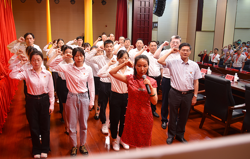 面向鲜红的党旗,陈日兰举起右拳,带领新党员庄严宣誓、老党员重温入党誓词。