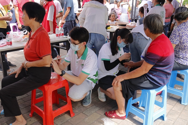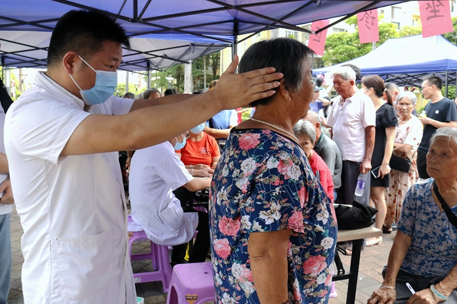 20日,实践队在老师的带领下来到月亮湾社区进行义诊活动。义诊现场,前来参与诊疗的居民络绎不绝,专家们通过望、闻、问、切准确了解居民病情,采用针灸、推拿、壮医药线点灸等方法为其治疗。学生队员们为居民分发党史宣传手册,号召群众学习党史,同时提供测量血压、手法按摩和艾灸等服务。本次义诊赢得了广大群众的高度赞赏,还有居民为专家送上锦旗以表谢意。