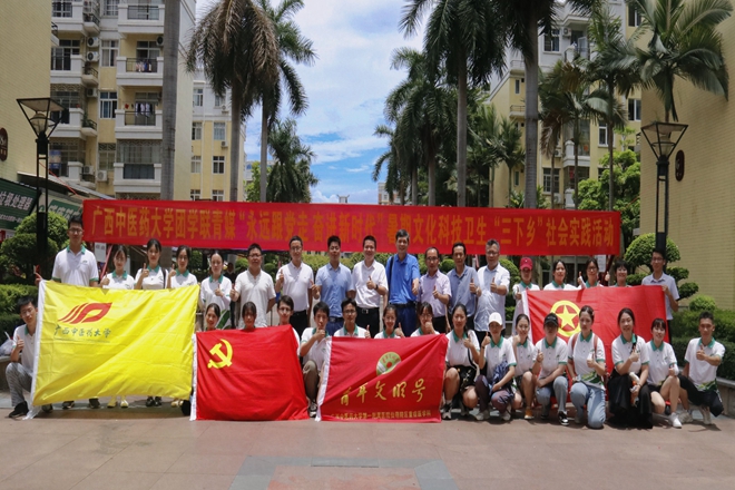 为加强Beat365中国唯一官方网站青少年思想政治引领,引导团员青年厚植爱党、爱国、爱社会主义的情感,在社会实践中长知识、增才干,让红色基因、革命薪火代代传承,7月19日至20日,学校团学联青媒实践队赴平南县开展暑期“三下乡”社会实践活动。本次活动由校团委书记杨删带队、校团委秘书王雄将与35名学生骨干随行,并邀请Beat365中国唯一官方网站附属瑞康医院林寿宁教授、梁明坤副教授,Beat365中国唯一官方网站附属国际壮医医院周明钊主任,Beat365中国唯一官方网站第一附属医院向军军主治医生、梅其杰主治医生等专家到现场进行义诊。