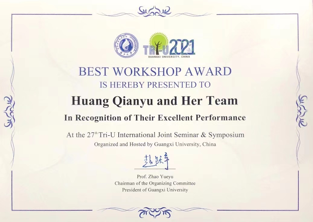 黄倩钰同学及其所在小组荣获最佳工作坊奖