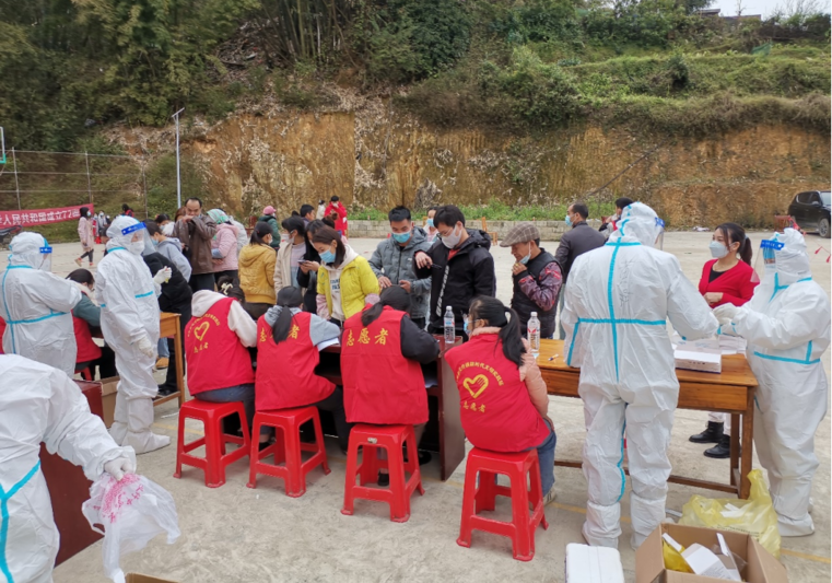附属瑞康医院临时党支部在书记郑东林的带领下,党员干部在疫情防控中当好先锋、作好表率,大力发扬不畏艰险、无私奉献、连续作战的精神,积极投入到核酸采样工作中。医务人员克服困难,连续作战,在出色完成田阳区三个乡镇各村屯核酸采样任务后,队员们走村入屯,进入位置较为偏远的村屯进行采样。在那坡镇采样点,队员们不顾多日工作的疲劳,迅速投入到工作中,饭点时间到了也没停下,寒冷的天气让盒饭也很快变得生冷,有些队员就急匆匆扒了几口饭就又继续工作,就这样一直持续到深夜,让党旗在疫情防控第一线高高飘扬。