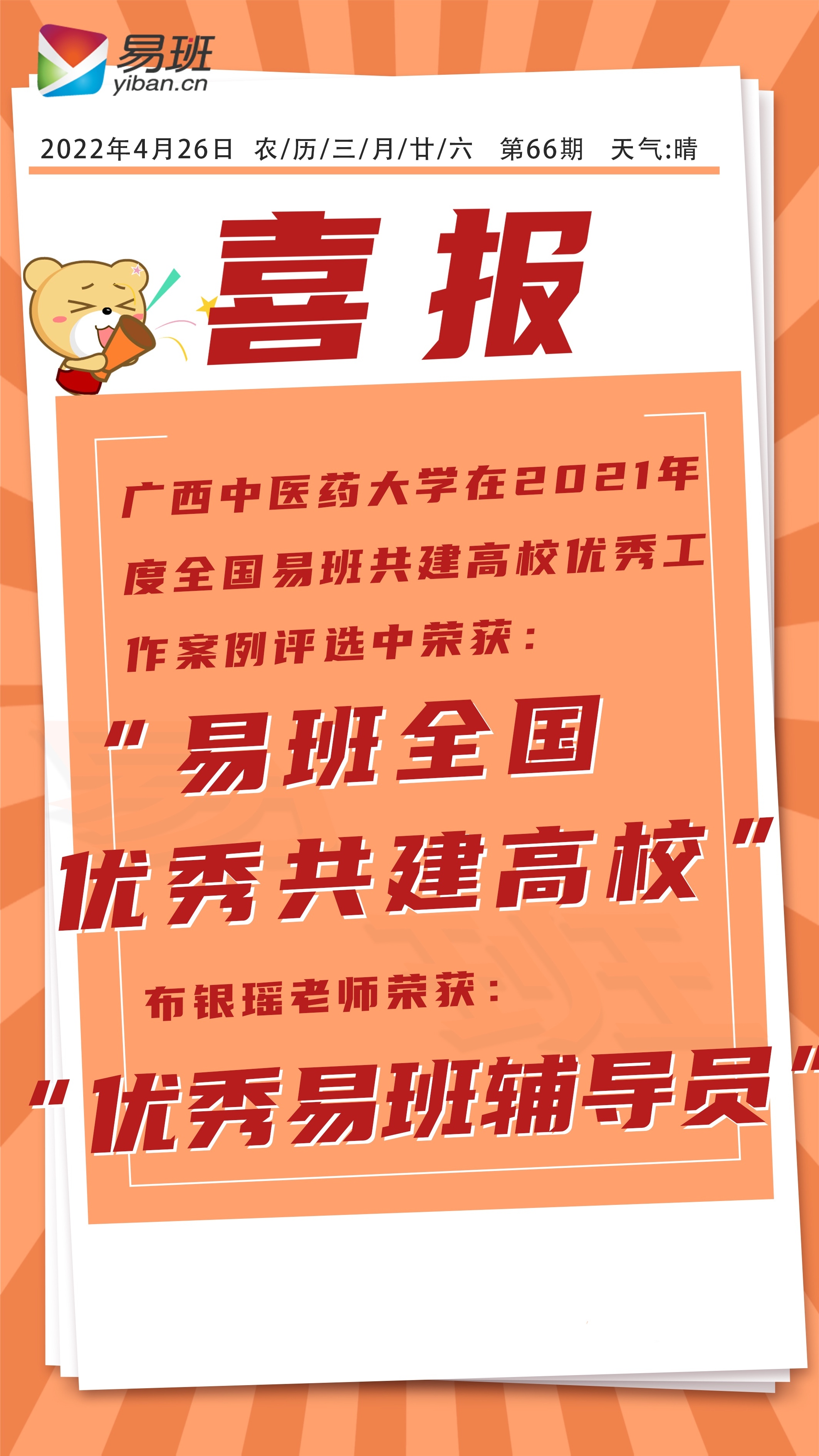 为深入学习贯彻习近平新时代中国特色社会主义思想和党的十九大精神,把贯彻落实全国高校思想政治工作会议精神进一步引向深入,推进落实《教育部等八部门关于加快构建高校思想政治工作体系的意见》(教思政〔2020〕1号)文件精神,按照2021年教育部思政工作要点要求,加强高校依托易班开展网络思政工作的能力,推动全国高校网络文化建设,进一步提升各共建高校开展网络思政和易班建设的质量,增强高校运用易班开展网络思想政治教育和网络文化建设的能力,教育部易班发展中心开展了2021年度全国易班共建高校优秀工作案例的遴选及展示工作。Beat365在2021年度全国易班共建高校优秀工作案例评选中荣获“优秀易班共建高校”,布银瑶老师荣获“优秀易班辅导员”。