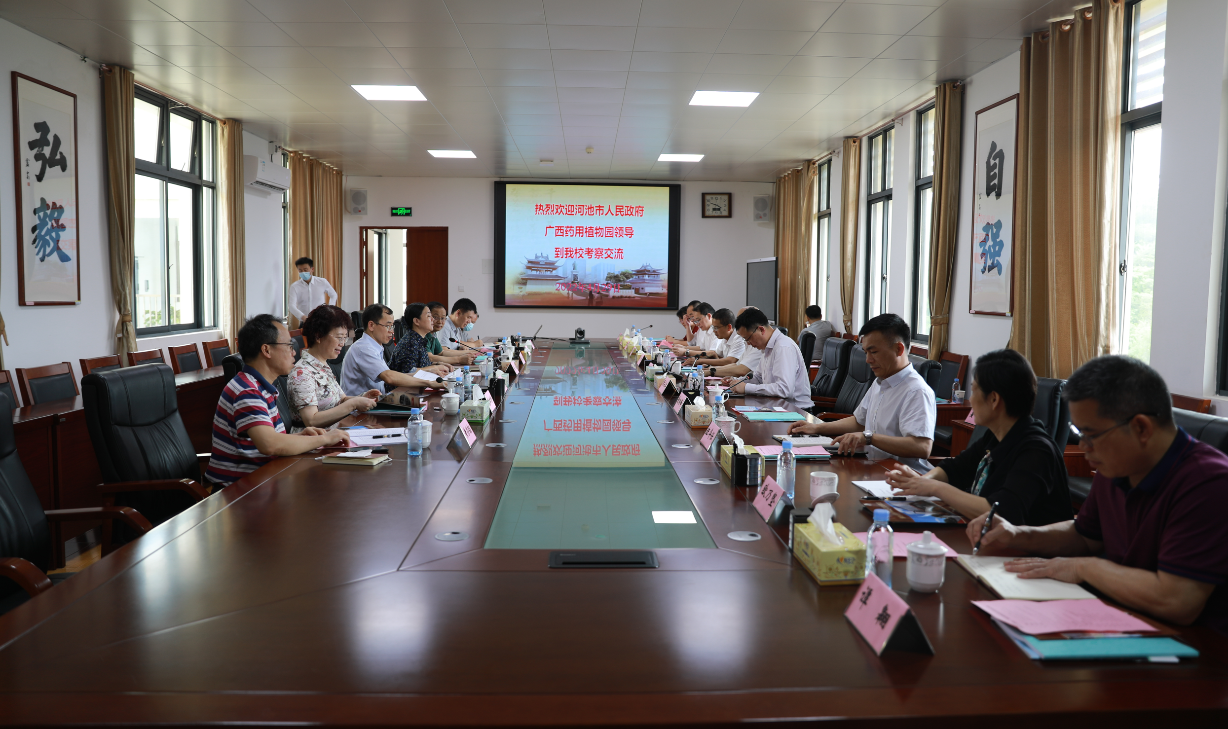 4月29日下午,河池市人民政府副市长曹崇俊一行,广西药用植物园主任张占江一行来Beat365仙葫校区交流合作事宜。