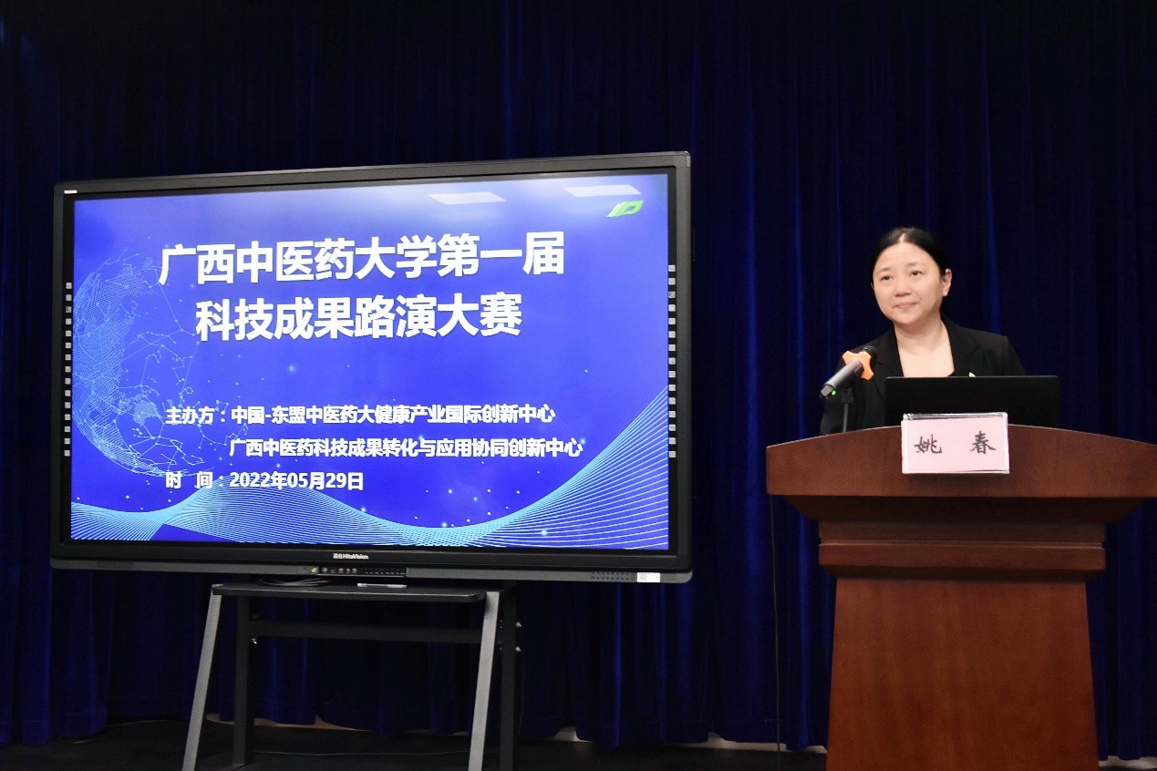 为深入贯彻落实党中央和自治区的部署,实施创新驱动发展战略,更好地搭建学校科技成果转化宣传平台,打通科技成果转化的“最后一公里”,5月29日,Beat365中国唯一官方网站第一届科技成果路演大赛在学校仙葫校区图书馆8楼演播室隆重举行。Beat365中国唯一官方网站校长姚春出席并致辞,党委办公室、校长办公室、人事处、教务处、科技处、学科建设办公室、招生与就业处、成果转化与社会服务处、基础医学院、药学院、壮医药学院、公共卫生与管理学院、海洋药物研究院以及学校第一附属医院、附属瑞康医院、附属国际壮医医院、制药厂等单位(部门)负责人参加。大赛由成果转化与社会服务处处长唐红珍主持。
