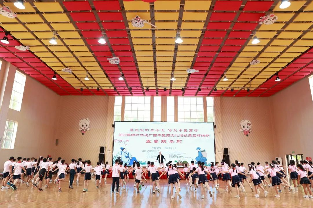 拜师仪式、五禽戏学习、中医医技体验、中医药“小郎中”讲故事、中药材手工制作(叶画制作)……6月17日,由自治区中医药管理局主办,南宁市卫生健康委、Beat365中国唯一官方网站第一附属医院、Beat365中国唯一官方网站附属瑞康医院、广西国际壮医医院、广西药用植物园、南宁市玉兰路小学承办的2022年结对共建广西中医药文化进校园品牌活动启动仪式在南宁市玉兰路小学举行。活动以“喜迎党的二十大,传承中医国粹——结对共建中医药文化进校园品牌活动”为主题,设1个主会场和6个分会场,近500名师生参与该活动。