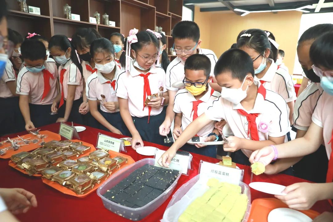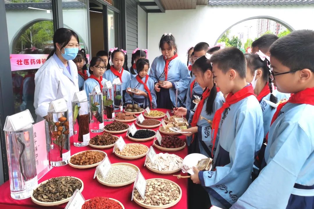 在学校壮医药体验馆,现场展出中医药膳、“桂十味”中草药标本、药食同源药材、中医治未病特色文创产品等。师生们近距离观赏桂十味、药食同源等中医药材,现场中医药专家进行辨识科普讲解,大家还品尝绞股蓝蛋糕、山药茯苓糕、豆卷杏仁糕、山楂乌梅棒棒糖等美味养生的中医药膳。