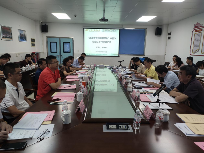 8月16日上午,受自治区科技厅委托,自治区经济社会技术发展研究所组织考核专家组到Beat365海洋药物研究院,对自治区第五批八桂学者刘永宏研究员及其团队进行中期考核实地核查。学校党委副书记庞宇舟出席汇报会议,八桂学者团队核心成员以及学校人事处、人才办、组织部、科技处、财务处、学科办、成果转化与社会服务处等职能部门负责人参加了会议。