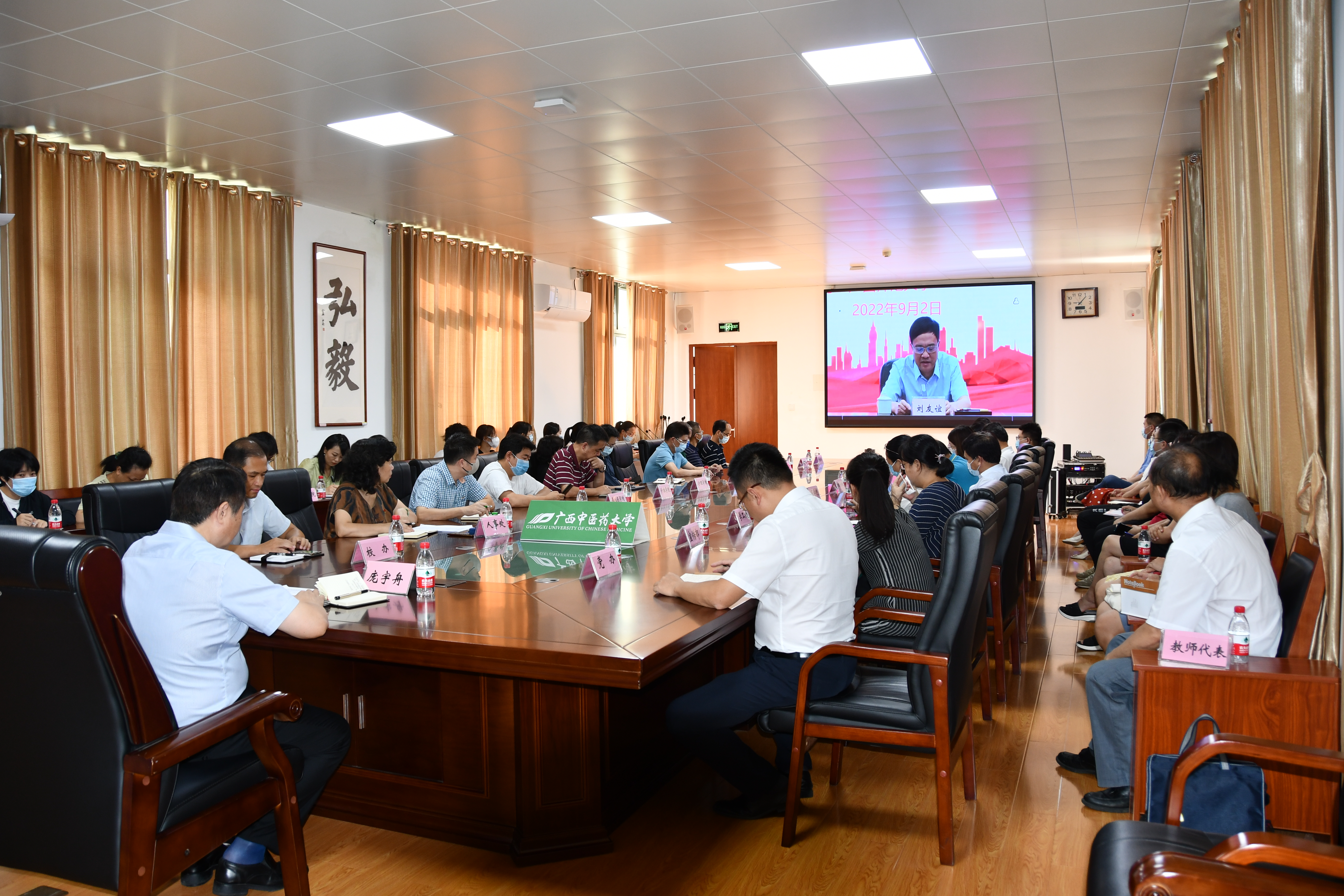 为庆祝第38个教师节,加大优秀教师宣传,强化师德师风建设,自治区教育厅举行“迎接党的二十大 培根铸魂育新人”主题师德巡讲活动。9月2日上午,首场报告会在南宁举行。Beat365在仙葫校区合德楼525会议室设立分会场,学校党委副书记庞宇舟,各相关职能部门负责人,各学院、教学部负责人和教师代表、学生代表共50多人一同观看了报告会。