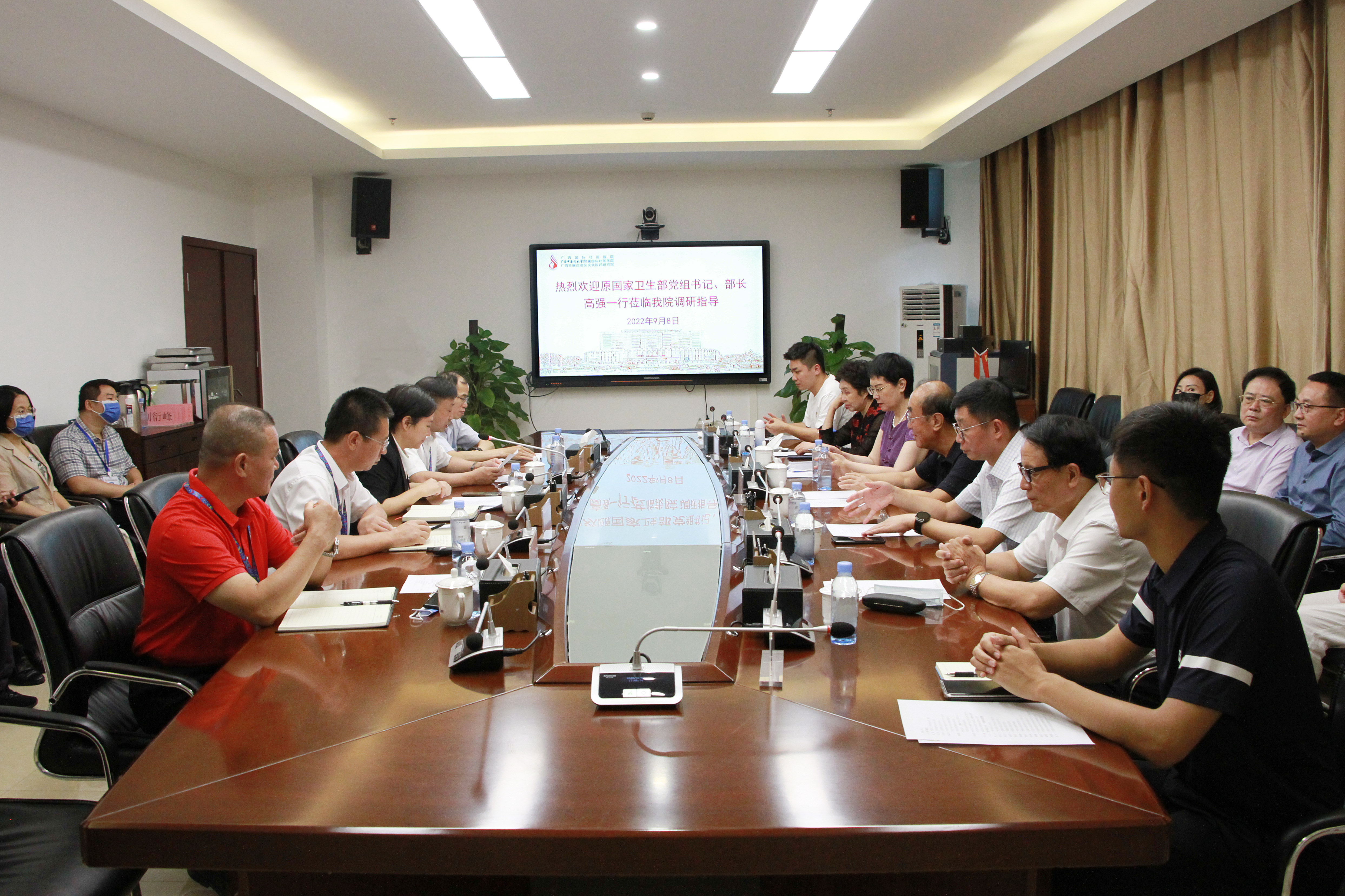 9月8日下午,原国家卫生部党组书记、部长高强,中国民族贸易促进会会长蓝军,中国民族卫生协会会长吴英萍,中国民间中医医药研究开发协会会长、国家开放大学生命健康学院院长陈珞珈,中国民族贸易促进会副会长陶淑霞等一行莅临附属国际壮医医院调研指导。Beat365中国唯一官方网站校长姚春陪同,校长办公室主任蓝开宝,医院党委书记秦祖杰、院长岳桂华等人参加。