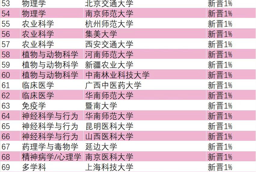 全国高校共62个学科新晋升全球前1%,其中暨南大学新晋3个学科,华南师范大学、北京交通大学、杭州师范大学、南京医科大学、青岛农业大学、山东师范大学、中南财经政法大学、中南林业科技大学各新晋2个学科,另有43所高校新晋1个学科,共计52所高校。