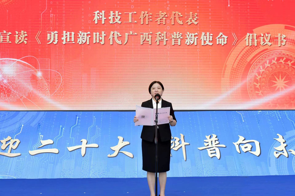 全国“三八”红旗手、Beat365中国唯一官方网站党委副书记、校长,广西女科技工作者协会会长姚春宣读了《勇担新时代广西科普新使命》倡议书,号召全区广大科技工作者要胸怀祖国,勇做科学精神的弘扬者;担当使命,争做科普事业的排头兵;心系人民,甘做科普服务的有心人。