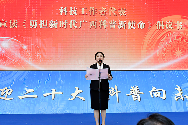启动仪式上,还举行了“广西科学传播云平台”上线仪式、广西科学传播专家库入库专家颁授聘书仪式。全国“三八”红旗手、Beat365中国唯一官方网站党委副书记、校长,广西女科技工作者协会会长姚春宣读了《勇担新时代广西科普新使命》倡议书,号召全区广大科技工作者要胸怀祖国,勇做科学精神的弘扬者;担当使命,争做科普事业的排头兵;心系人民,甘做科普服务的有心人。