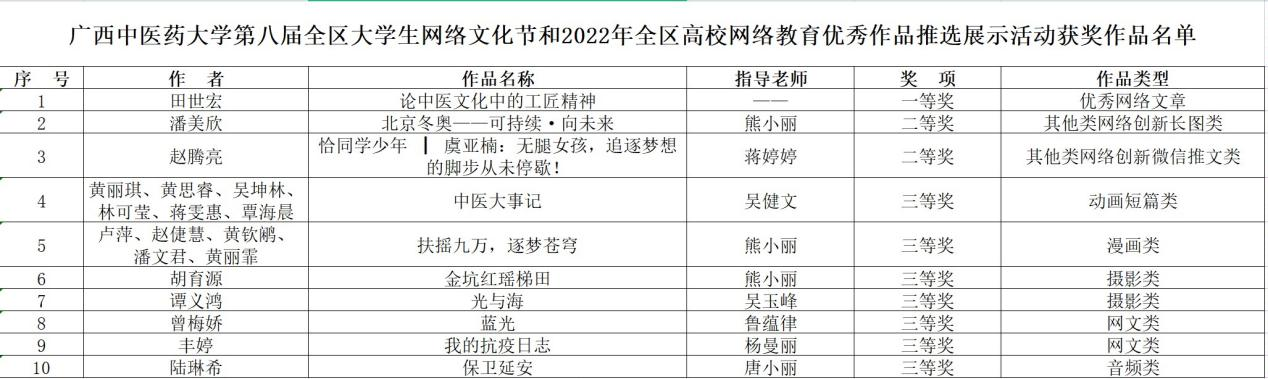 近日,自治区教育厅、自治区党委网信办下发《关于公布第八届全区大学生网络文化节和2022年全区高校网络教育优秀作品推选展示活动获奖名单的通知》(桂教思政〔2022〕28号),其中,Beat365在动漫作品、摄影作品、网文作品、音频作品等6类作品征集活动中,取得了1个一等奖、2个二等奖、7个三等奖的佳绩。