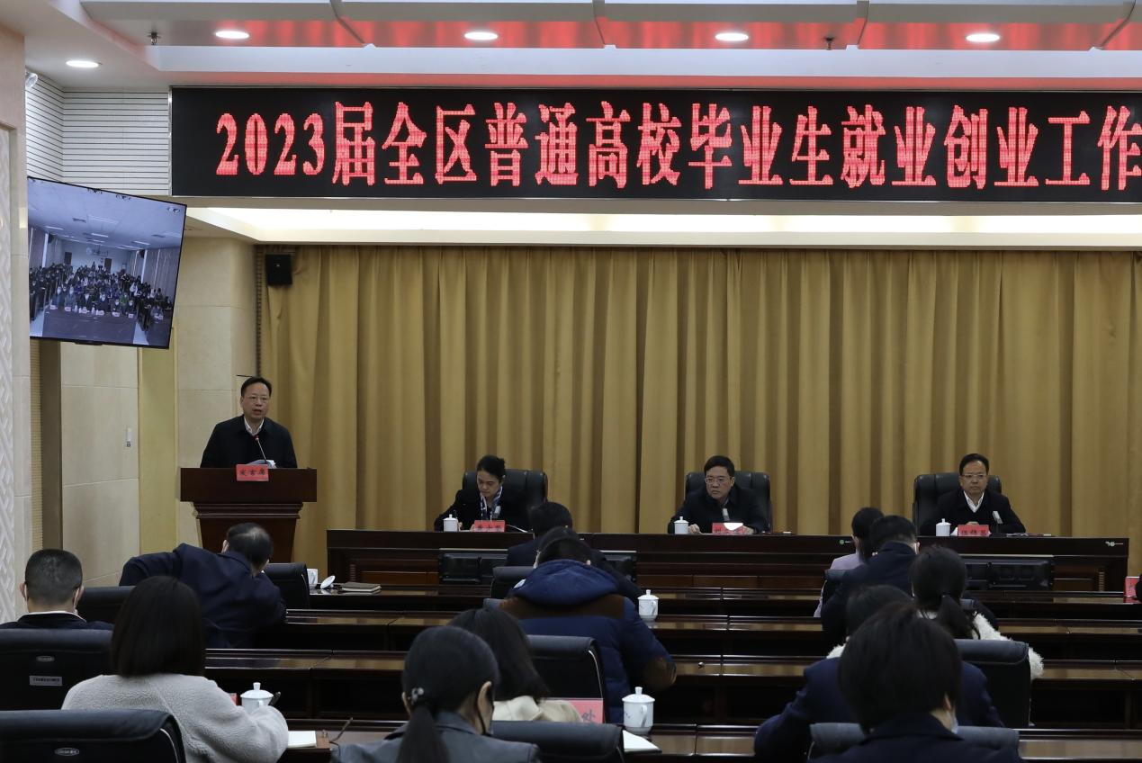 12月7日,自治区教育厅、自治区人力资源和社会保障厅联合召开“2023届全区普通高校毕业生就业创业工作网络视频会议”,自治区党委教育工委书记、教育厅厅长刘友谊,自治区人力资源和社会保障厅二级巡视员黄少坚出席会议并讲话,自治区教育厅副厅长伍锦昌主持会议。会议总结了我区2022届毕业生就业创业工作取得的成效,分析了2023届就业创业工作面临的形势并指出了工作重点和目标,要求各高校迅速学习传达本次会议精神,狠抓责任落实,完善保障措施,加强教育引导,促进毕业生高质量充分就业。