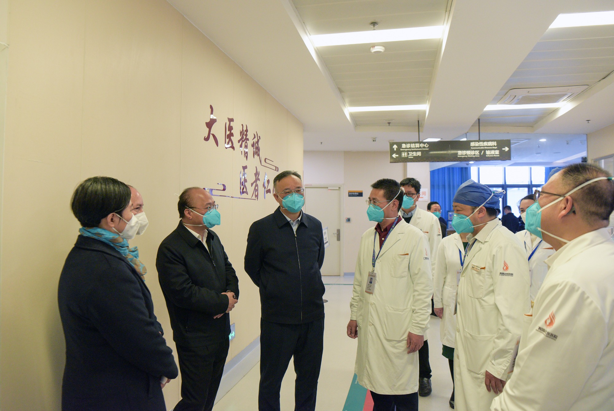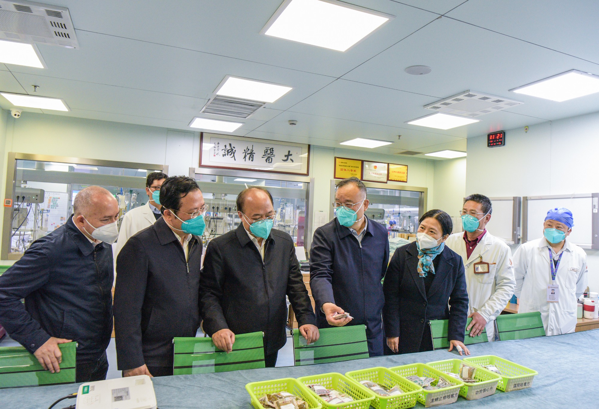 黄俊华(前左四)在重症医学科调研,充分肯定壮瑶医药在新冠病毒感染患者救治工作中发挥的重要作用