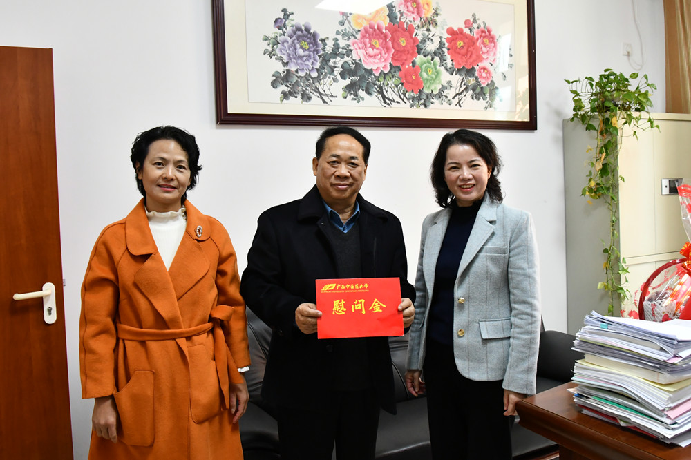新春佳节到来之际,学校党委书记莫锦荣,校长姚春,副书记庞宇舟、何并文,副校长冷静,纪委书记覃宇环,总会计师何刚亮,分别在学校相关部门负责人的陪同下慰问离退休干部、老党员、生活困难职工、高层次人才代表、教师代表等。