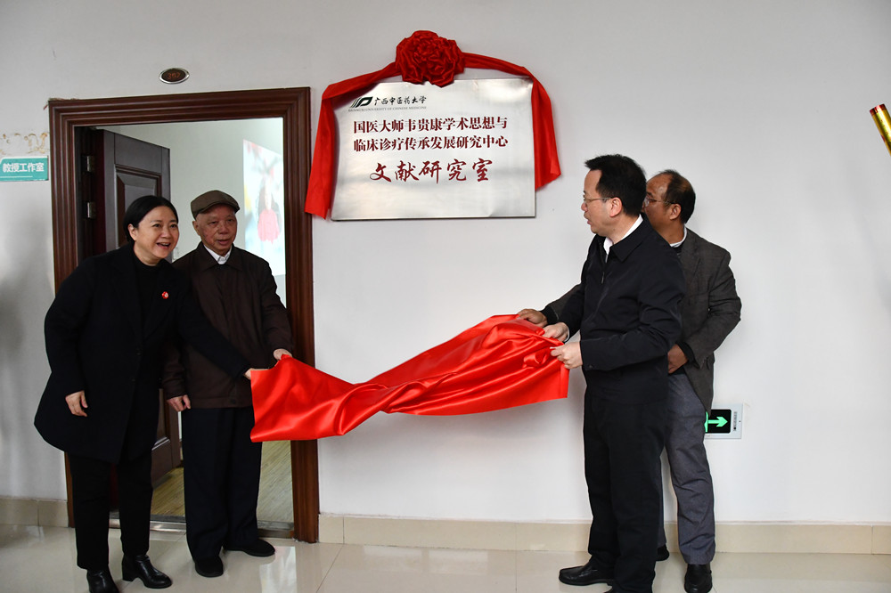 3月2日上午,国医大师韦贵康学术思想与临床诊疗传承发展研究中心文献研究室揭牌仪式在仙葫校区举行。校党委书记莫锦荣,校长姚春,国医大师韦贵康教授,党委副书记庞宇舟,学校相关部门负责人,教师以及学生代表等参加了揭牌仪式。仪式由庞宇舟主持。