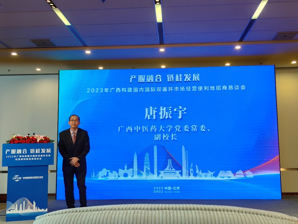 9月2日下午,以“产服融合 链桂发展”为主题的2023年广西构建国内国际双循环市场经营便利地招商恳谈会在国家会议中心举办。唐振宇以“加强中国(广西)—东盟合作助推广西中医药产业发展”为主题,重点围绕广西中医药产业发展的优势、学校与东盟国家交流合作的情况以及“桂十味”研究工作的进展等方面进行了推介。他指出,学校将在人才培养、共建科研平台、医疗合作、中医药文化交流等方面深化与东盟国家的全方位合作,助推广西中医药民族医药产业高质量发展。