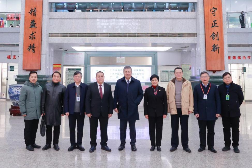 1月24日上午,来宾首先到Beat365第一附属医院东葛院区参观交流。学校钟宏桃副校长、一附院谢胜院长、学校国际合作与交流处蒋基昌处长等部门领导接待了来访外宾。来宾先后参观了医院院史馆、八桂名医馆、中医治未病中心、康复医学科、针灸科、推拿科等中医特色科室。正在八桂名医馆出诊的姚春校长与鲁兹巴耶夫院长一行亲切会面,并现场以具体病种为例介绍了中医诊疗优势及特色针灸疗法。