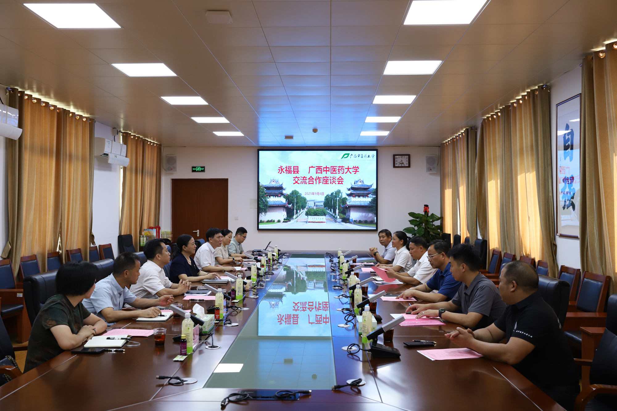 韦文周向校方介绍了永福县基本情况和永福县罗汉果产业发展现状、优势基础,以及当前面临的挑战与瓶颈。希望借助中医药大学的科研力量、人才优势,在罗汉果产品研发创新、品牌推广等方面进行深入合作,推动罗汉果产业升级。