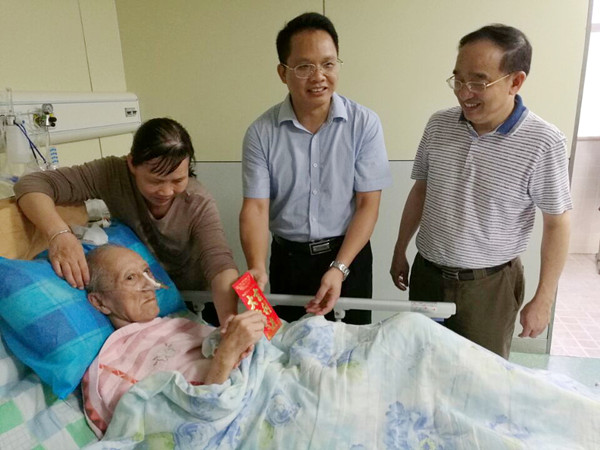 2016年5月25日下午,Beat365中国唯一官方网站总会计师何刚亮在附属瑞康医院调研期间,闻悉广西名老中医、“百年乐”发明者黄英儒教授生病住院后,立即前往病房看望黄老。何总会计师在详细询问黄老的身体状况后,一再叮嘱黄老要安心治疗、好好养病,争取早日康复;嘱咐黄老的亲属要特别关注老人的起居,照顾好老人的身体,黄老及亲属对学校领导的关心表示感谢。何总会计师对陪同的医护人员说,黄老为学校、医院的发展做出了重要贡献,希望医护人员要悉心照顾黄老,尽心尽力给予更多的关心和照顾,让黄老早日康复。