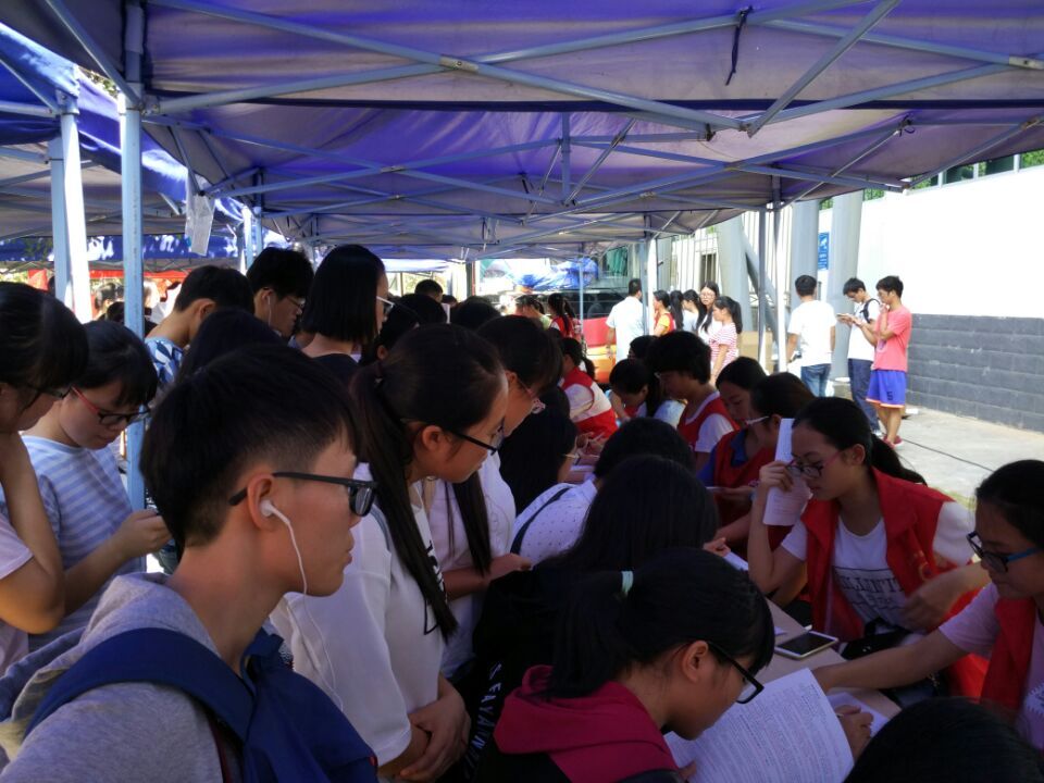 早上8点,大学生红十字会的队员们便开始忙碌起来。本次的场地范围比往次要大得多,三辆血车缓缓开进学校,整齐排列。前来献血的同学络绎不绝,活动开展不到半个小时,献血的队伍已经排起了长龙。在活动现场,红十字会的队员们有耐心给献血同学解惑的;有细心指导填表、讲解流程、宣传造血干细胞知识的;有为献血同学送水服务的;也有给献血同学发放纪念品的,活动进行得有条不紊。参与无偿献血的老师和同学们不顾烈日炎炎,井井有条地填表、体检、献血。