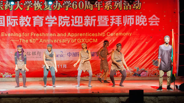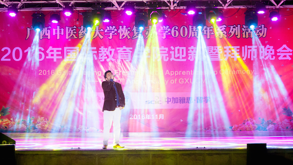 11月12日晚7:00,作为学校恢复办学60周年系列活动之一,2016国际教育学院迎新晚会暨拜师晚会在学校明秀校区足球场隆重举行。学校戴铭副校长、马来西亚驻南宁总领事馆黄奕瑞总领事、华尔特·费南迪副总领事、越南驻南宁总领事馆黎英俊领事、国际教育学院蒋基昌院长、韦文朗副院长、学校学工处、团委、招就处等各单位、各二级学院领导老师、2013级国际传统中医班全体带教导师等出席了晚会。