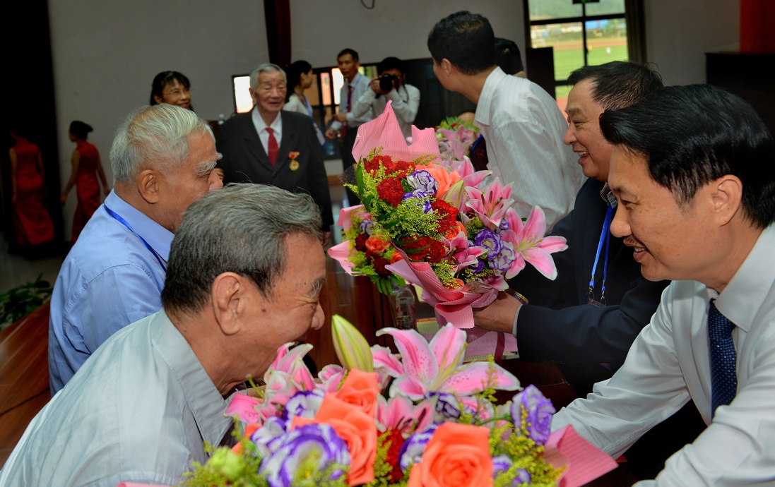 庆典会上进行了感恩仪式,主席台领导嘉宾向药学院老教师代表赵一教授、谢崇源教授、许学健教授、辛宁教授献花。这些老教师为药学院的建设发展贡献了毕生精力。他们兢兢业业,培育了一代又一代优秀的药院学子。药学院事业的发展,他们功不可没。今日他们多已两鬓斑白,然而他们的贡献永远在发光发亮。