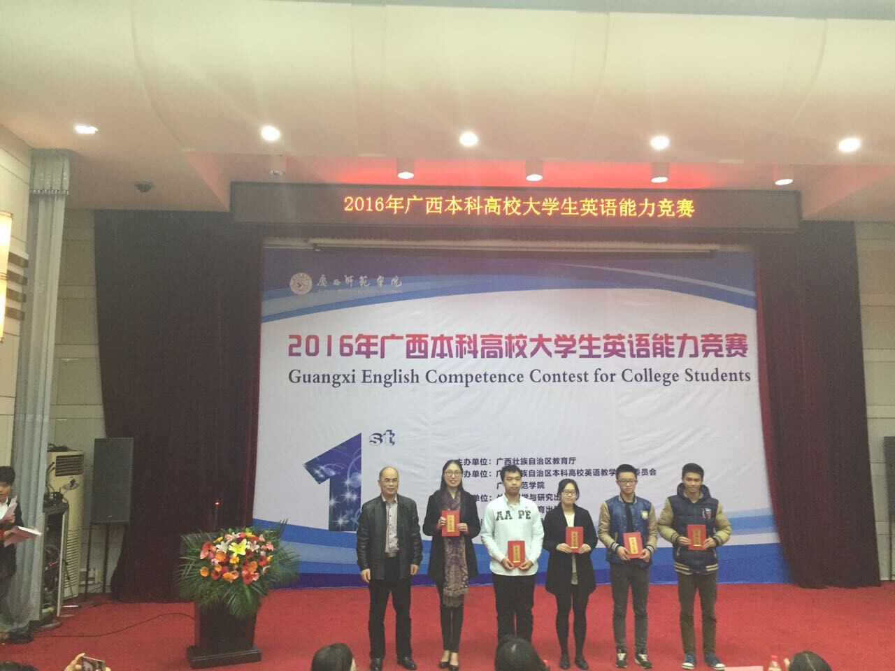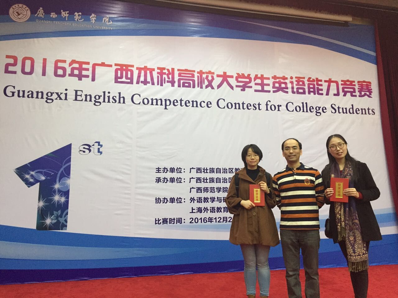 12月2日至 3日,由广西壮族自治区教育厅主办,广西本科高校英语教学指导委员会和广西师范学院承办的2016年广西本科高校大学生英语能力竞赛在广西师范学院隆重举行。来自区内33所本科高校的学生展开激烈角逐。Beat365护理学(英语方向)王星星同学在激烈比赛中脱颖而出,获得一等奖,2015级王羽珩同学获得三等奖,外语部周锋、葛雯雯老师获得优秀指导教师奖,学校获得优秀组织奖。