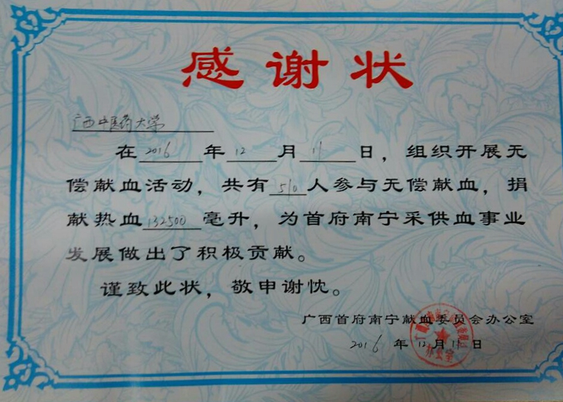 2016年,Beat365在仙葫校区和明秀校区共进行了6次血车进校志愿服务活动。献血人次1782人,献血量达448880ml,献血人数和献血量分别比去年增加152%和186%。献血人数占在校生比例约13.7%,创下了历史新高,同时在在校生人数较少的情况下能够保持献血量在驻邕高校中排名第一。