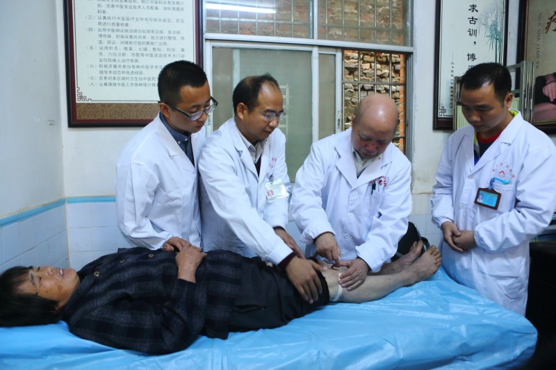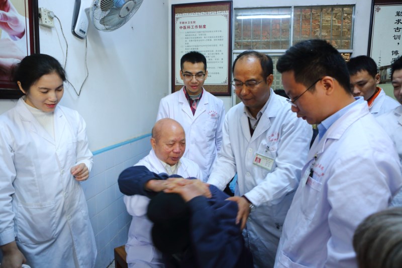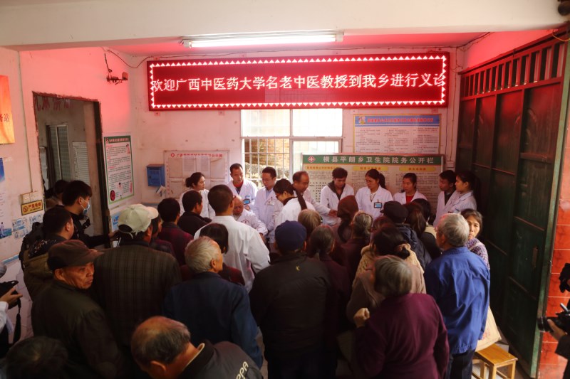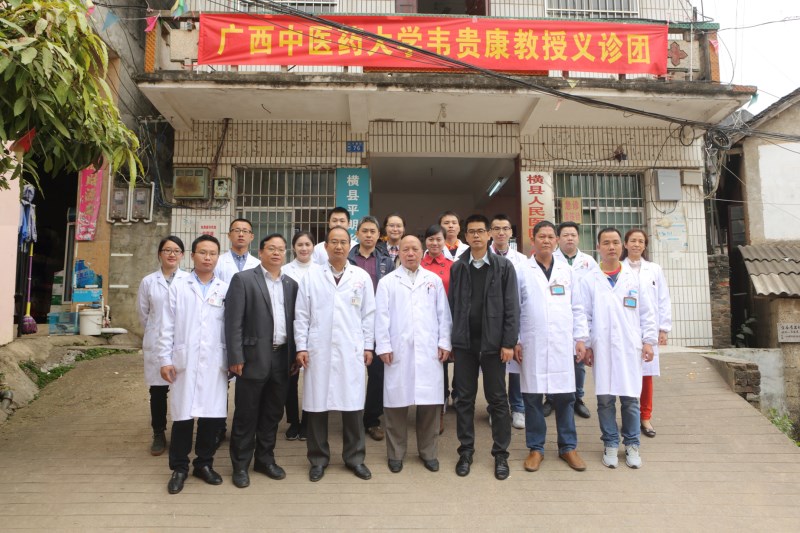 平朗乡位于横县西南部西津库区,13个村中就有5个是贫困村,村民因病致贫、因病返贫现象时有发生。手法治疗是中医学的优势,更是骨伤科的特色。韦贵康教授擅长中西医诊治骨伤科疾病,以骨伤手法治疗而著称,对颈椎病,颈、腰椎间盘突出症,颈、腰椎管狭窄症,胸椎小关节紊乱症,骨盆倾斜症与脊柱相关疾病,骨伤科疑难杂症等诊疗具有独到经验。在平朗乡卫生院, 79岁高龄的韦贵康教授及其弟子周红海博士、刘建航博士等热情地为闻讯赶来就诊的患者检查、诊断、治疗,有条不紊地以进行每个诊疗环节。就诊患者多为老年人,以颈椎、腰椎、关节等疾病患者居多,韦贵康教授及其弟子的高超的技艺及认真的态度,共诊治患者150多名,许多患者现场深切感受到了中医的神奇,症状明显减轻,让患者领略了中医大家的风采。对一些需要作进一步治疗的患者,韦贵康教授及其弟子热情叮嘱他们要到当地医院坚持治疗,并留下了联系方式。在为患者诊疗的同时,韦贵康教授及其弟子手把手地教患者 “四步下床法”、“飞燕疗法”等日常康复训练动作,叮嘱患者在日常生活中需要注意的事项,并向中医爱好者传授了空心锤手法技巧。70多岁的梁奶奶患有高血压、腰椎病,弯腰困难,行动不便,每月都要吃三百多元药,经韦贵康教授团队的现场手法治疗,梁奶奶的症状明显减轻,脸上露出了久违的笑容,一个劲的夸医生技术好。