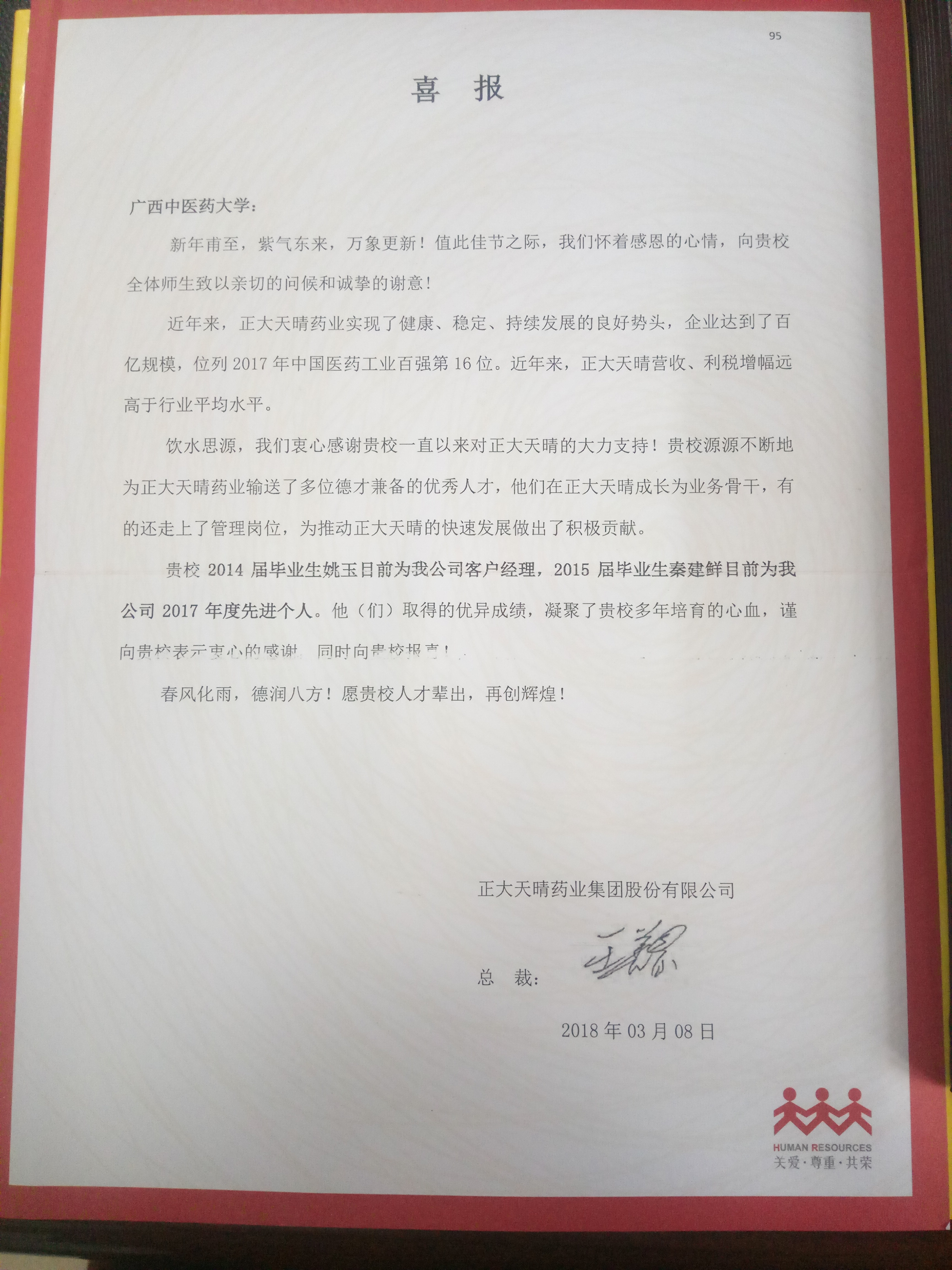 喜报上提到了Beat365毕业生在他的企业工作中,有的已经成长为业务骨干,有的走上了管理岗位,其中重点报告了2014届市场营销本科专业毕业生姚玉和 2015届中药学毕业研究生秦建鲜在公司工作表现及取得的优异成绩,并对Beat365在今后人才培养给予了厚望。