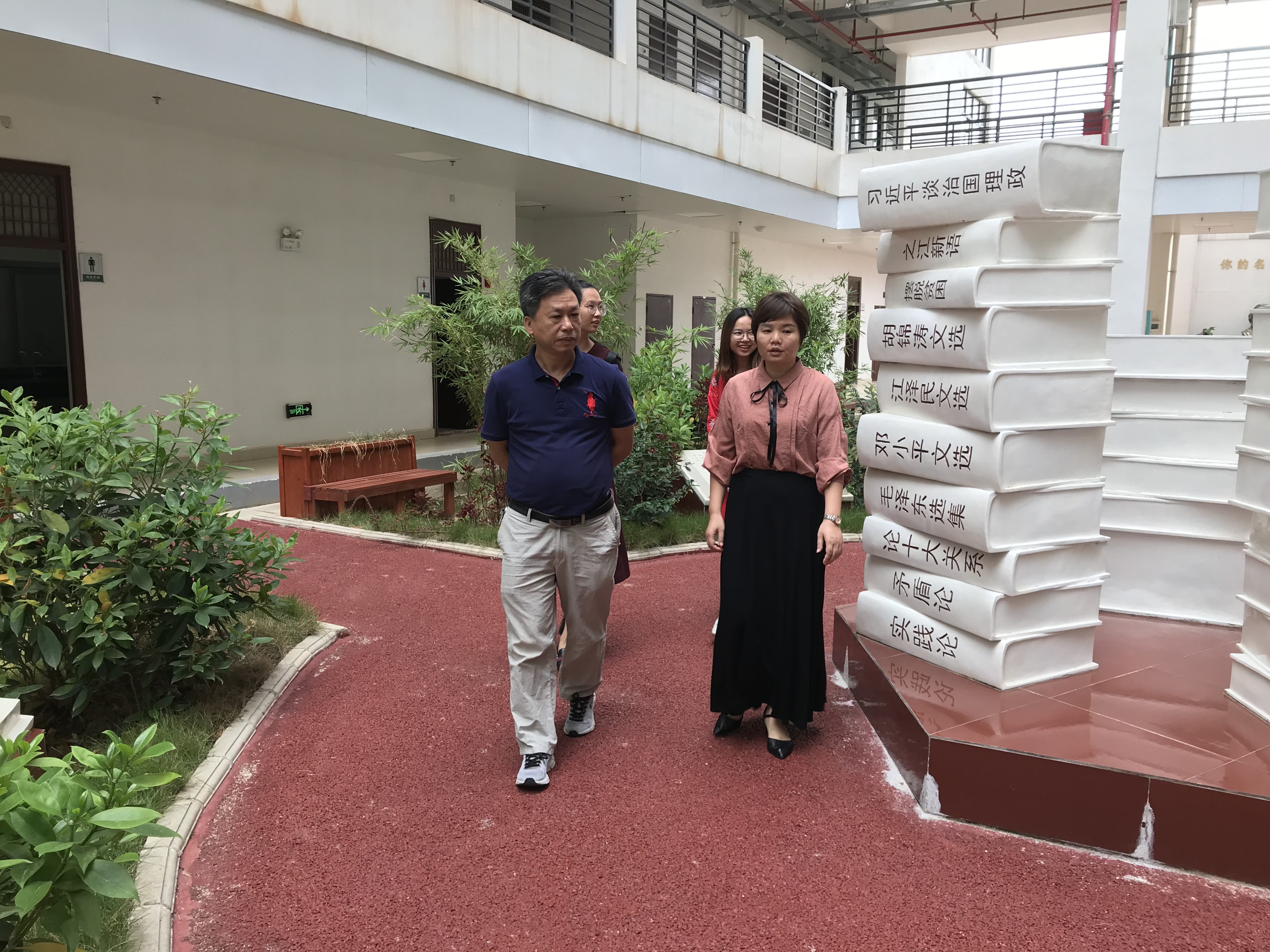 韦兆钧一行参观“马克思主义大众化广场”。“马克思主义大众化广场”是建立在学生宿舍内部的具有浓厚的马列氛围的文化广场,进入广场首先映入眼帘的是一幅刻有“马克思主义学院”院标的浮雕,浮雕上展示的是马克思和恩格斯的头像及他们的德文经典著作;走进广场,视野顿时开阔,花草芬芳,内部铺设塑胶道,建有休憩小凉亭,沿着小道可以边散步边研读马列经典著作,思考哲学问题,累着就在凉亭下休憩;广场两边的走廊分别是马克思主义大众化教育馆,党员活动室、马克思主义大众化学术报告厅,图书资料室等马院特设的机构部门,内部建设也极具马院的定位和特色。