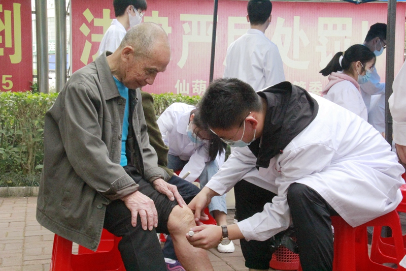 义诊活动中,志愿者为社区居民提供量血压、刮痧、艾灸、手法按摩等义诊服务,通过分发宣传手册、横幅签名等活动为居民宣讲百年党史,义诊现场气氛活跃,来往人群络绎不绝,受到了广大群众的高度赞赏。